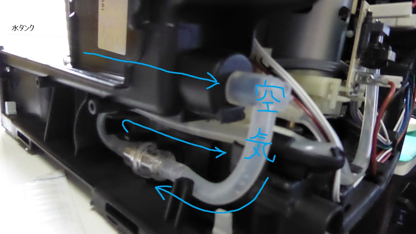 最初空だった水タンクの出口からのホースが水で満たされていた。